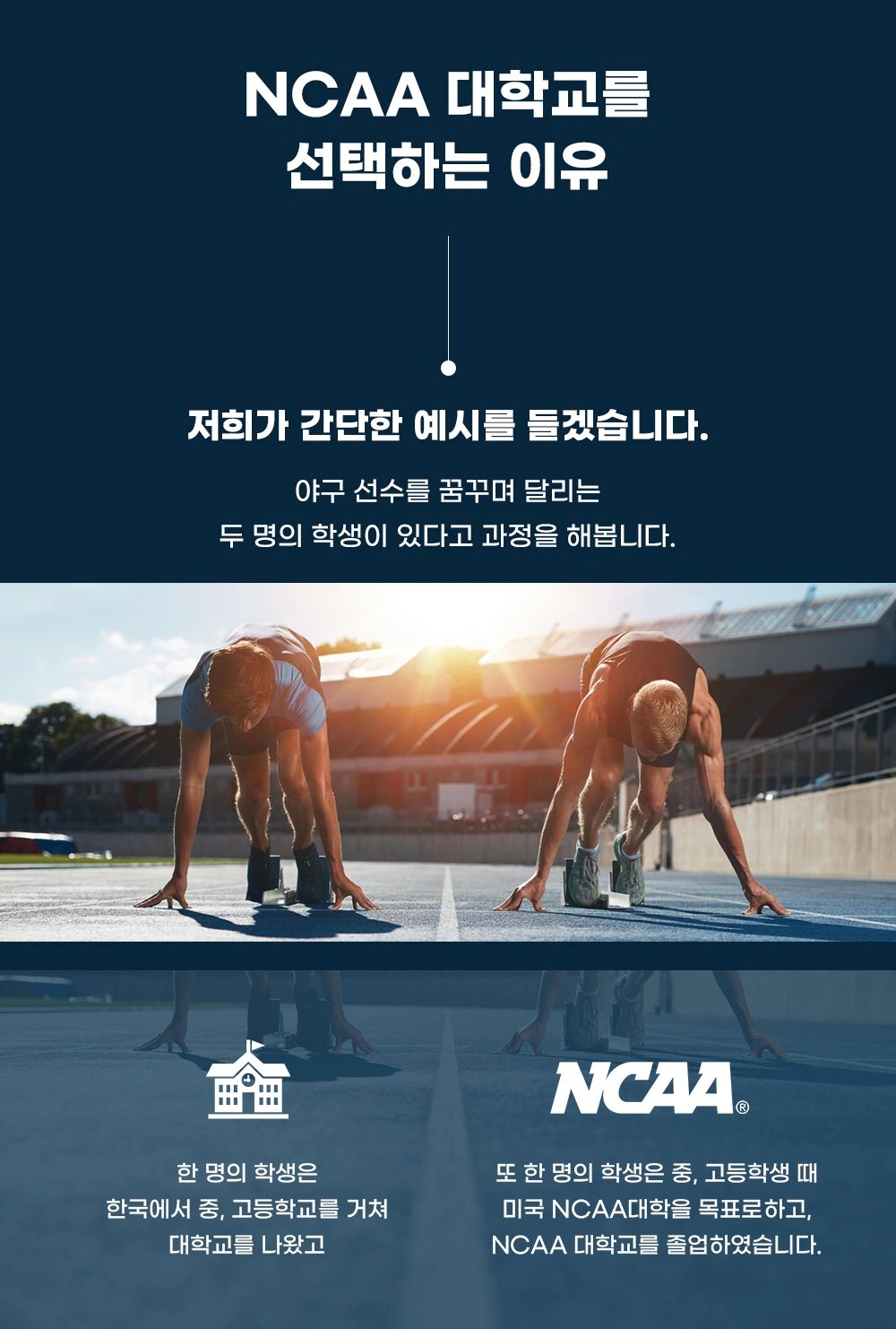 미국대학 입학사정관 협회, 미국 법무사협회, 미국 국무부 인가 최대교육재단 회원으로서 네트워크 와 미국현지에서 대학입시 전문 아카데미 및 센터 운영을 통해 얻은 에듀 큐레이션 노하우로 7학년 (중학교 1학년) 부터 미국체대입시 를 책입집니다.