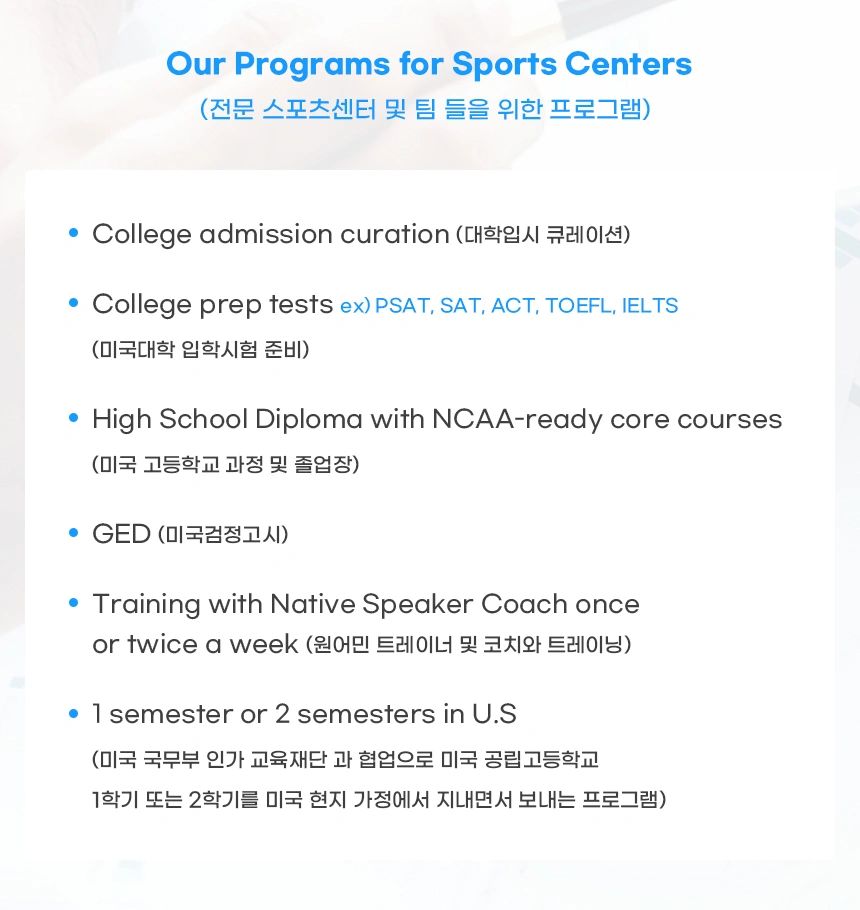 미국대학 입학사정관 협회, 미국 법무사협회, 미국 국무부 인가 최대교육재단 회원으로서 네트워크 와 미국현지에서 대학입시 전문 아카데미 및 센터 운영을 통해 얻은 에듀 큐레이션 노하우로 7학년 (중학교 1학년) 부터 미국체대입시 를 책입집니다.